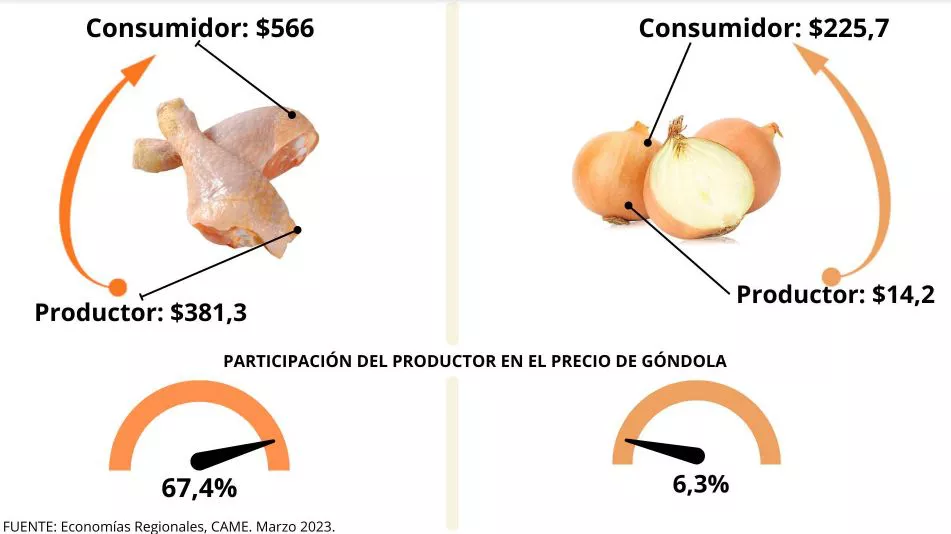 En promedio, la participación del productor explicó el 28,3% de los precios de venta final. La mayor participación la tuvieron los productores de pollo (67,4%), mientras que la menor fue para los de cebolla (6,3%).